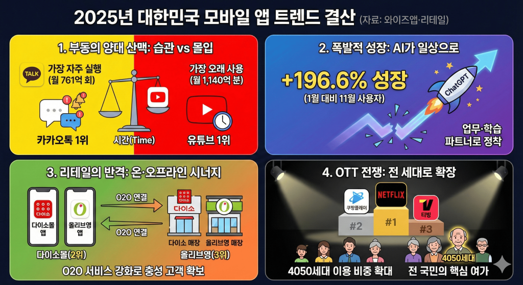 이는 카카오톡이나 네이버를 멀찌감치 따돌린 수치로, 한국인의 영상 콘텐츠 몰입도가 임계점을 넘었음을 시사한다.