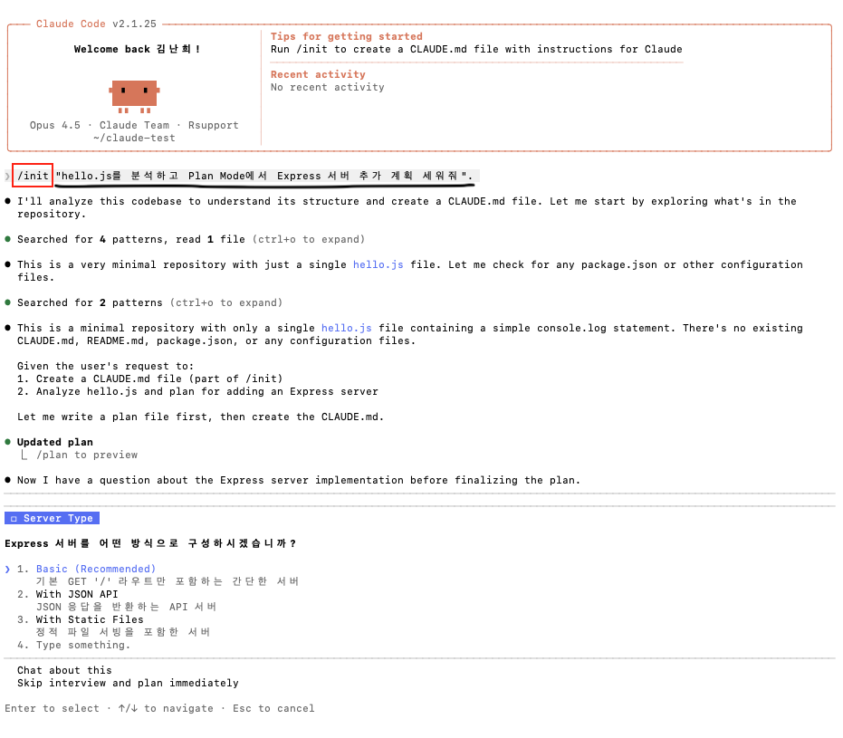 이 단계에서 Claude가 hello.js를 인식합니다.