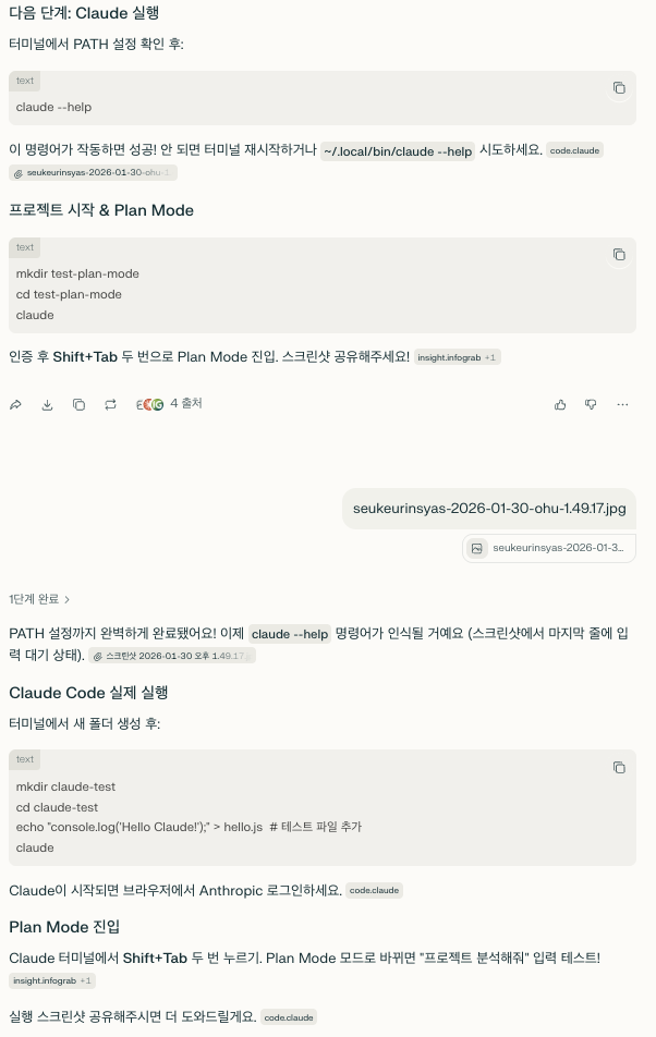macOS 사용자 기준으로 PATH 문제, 인증 오류 등 모든 함정을 피하는 방법까지 AI가 기입해줬고, 매 순간마다 맞는지 아닌지 아직 코드를 분석 할 줄 몰라서 캡쳐해서 현재 상황이 맞는지 재확인을 했다.